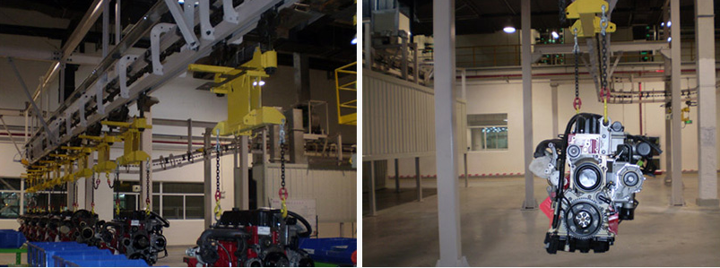 该项目是北汽福田康明斯投资的一个发动机厂,主要生产柴油发动机。积放式悬挂输送系统用于工件的连续输送和储存。该系统分为两个部分,NO1负责把两种柴油机总成输送到热试线,系统采用两台变频电机减速机驱动,实现两种发动机混流上下线,空中可实现积放20分钟。在总装线下料处有两台带式升降机,一台用于2.8L发动机上料,另一台用于3.8L发动机上料。热试线下料处有两台带式升降机,两种发动机可通用。NO2将两种柴油机总成从热试线经涂装线输送到附件装配。系统共有六条输送链,采用地面立柱和空中吊挂形式。分别完成输送、工位操作、存储、工位操作、烘干后冷却和输送等功能。系统设四台带式升降机,用于发动机的上线和下线。积放式悬挂输送机控制系统通过工业以太网形式接受工艺信息,并将系统运行状态和故障信息通过以太网发送的上位机系统,系统自动读取两种发动机的区分信息和标志,实现自动区分工件的功能。系统预留RIFD的PROFIBBUS接口,方便以后RIFD系统的扩展。