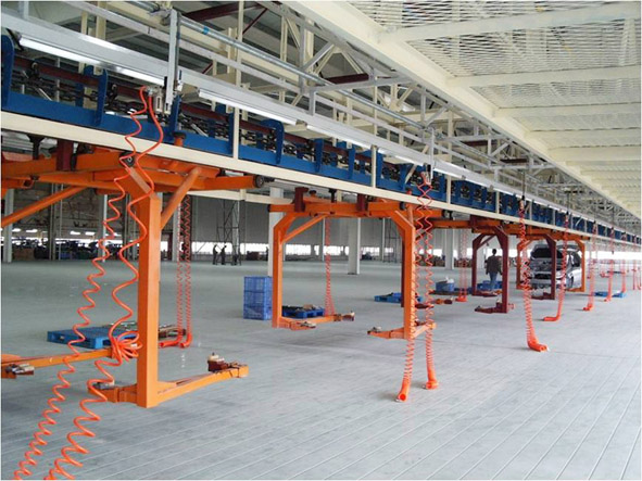 输送系统包括:1、PBS系统,采用摩擦式输送系统,用于漆后车身的输送、存储和排序;2、SUV内饰装配线采用CPC+空中摩擦输送系统,内饰工艺链采用CPC,内饰-底盘线及空抱具返回采用空中摩擦输送;3、移载设备自动完成漆后车身从涂装滑撬到PBS台车及内饰线的移载工作;4、PBS识别及控制系统采用现场总线,便于维护和系统调试。