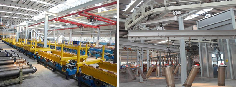综合油缸涂装生产线采用XT160悬挂输送机输送工件,输送速度在0.5-3m/min内可调,工作速度1.6m/min;变幅油缸涂装生产线采用积放式悬挂输送机,工件上下件出设有液压升降台配合工件上下输送设备;伸缩油缸涂装生产线采用地面小车输送工件,地面小车采用四套垂直地面链输送装置输送工件。