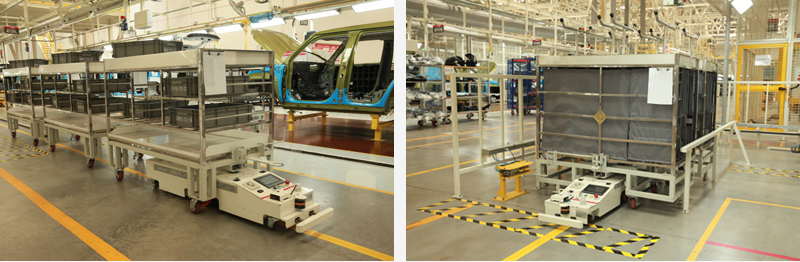 北汽(镇江)汽车有限公司属于北汽集团,主要生产中高端SUV及核心零部件,该AGV项目用于总装车间内饰线与车门线物料配送,配送方式采用SPS供给模式,并结合线边自动上下线系统,将物料按正确的数量在准确的时刻运送到正确的地点,实现无人化配送,满足生产线40JPH节拍。AGV采用磁道航导引系统,并通过控制系统与其他管理系统即时通讯,可实现无人自动化运输,是汽车行业等提升行业竞争力、减少人工成本、提高仓配效率的选择。